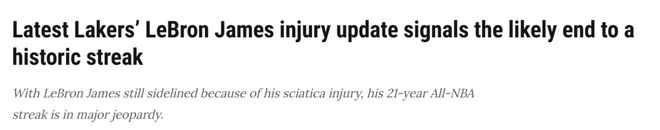 自2004-05赛季(职业生涯第二个赛季)以来,詹姆斯每年都能入选最佳阵容(一阵、二阵或三阵)。他连续21年入选最佳阵容的纪录堪称NBA历史上最难以打破的纪录之一,如今这一纪录正面临严峻挑战,这位湖人球星本赛季似乎很难延续这一成就。