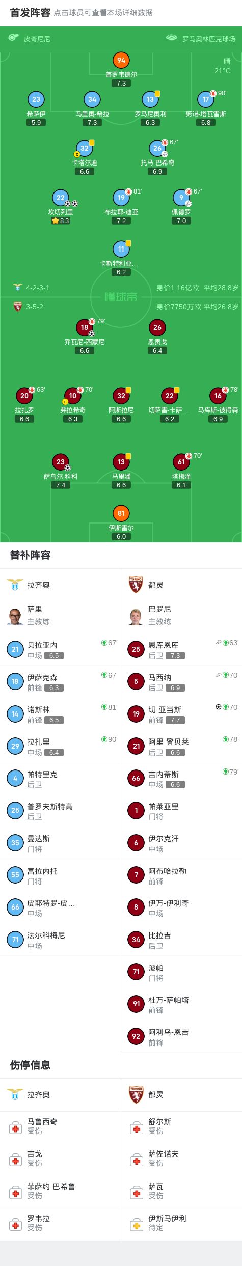 北京时间10月4日意大利足球顶级联赛 联赛 第6轮,拉齐奥主场对阵都灵。拉齐奥坎切列里梅开二度。都灵乔瓦尼-西蒙尼破门,切-亚当斯破门,萨乌尔-科科破门。最终比分拉齐奥 3-3 都灵。