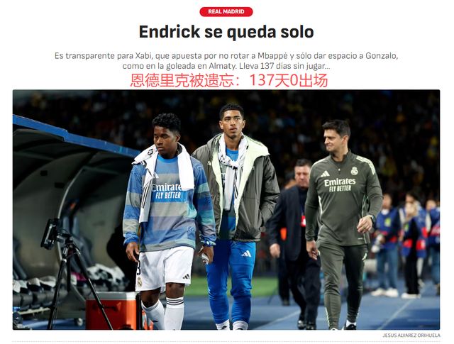 莫德里奇离开皇马之后,姆巴佩接过10号战袍,恩德里克则穿上姆巴佩留下的9号。不过,皇马9号却是边缘人:2025-26赛季,恩德里克出场0分钟。《阿斯报》指出,恩德里克上次代表皇马出场,还是5月18日的西甲客战塞维利亚,距今已有137天。